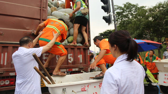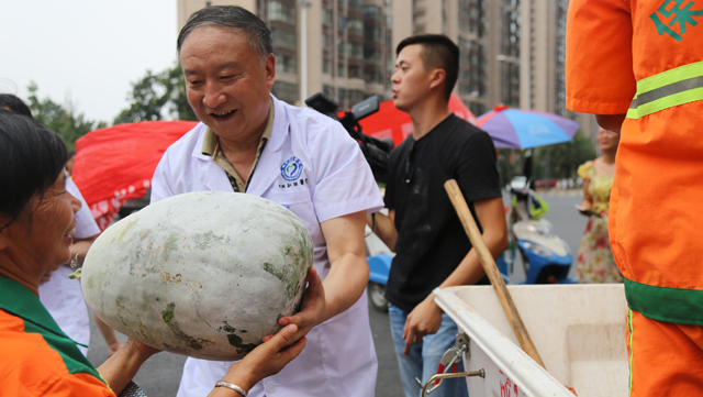 下午,四川肛肠医院将这批冬瓜运回成都后,直接送给在烈日下辛勤工作的环卫工人们。